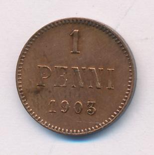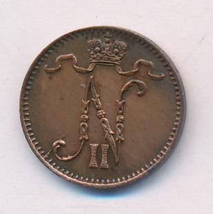 Лицевая сторона — вензель Александра II, оборотная — номинал (1 PENNIA) и дата. Нормативный вес — 1,28 грамма, гурт гладкий.