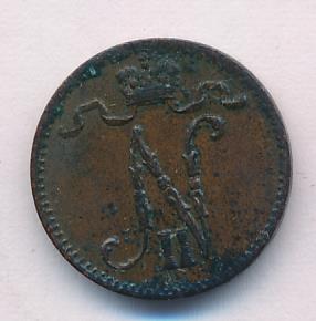Лицевая сторона — вензель Александра II, оборотная — номинал (1 PENNIA) и дата. Нормативный вес — 1,28 грамма, гурт гладкий.