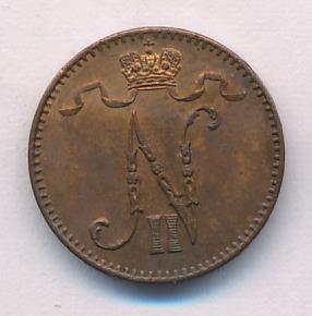 Лицевая сторона — вензель Александра II, оборотная — номинал (1 PENNIA) и дата. Нормативный вес — 1,28 грамма, гурт гладкий.