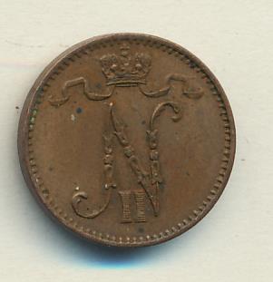 Лицевая сторона — вензель Александра II, оборотная — номинал (1 PENNIA) и дата. Нормативный вес — 1,28 грамма, гурт гладкий.