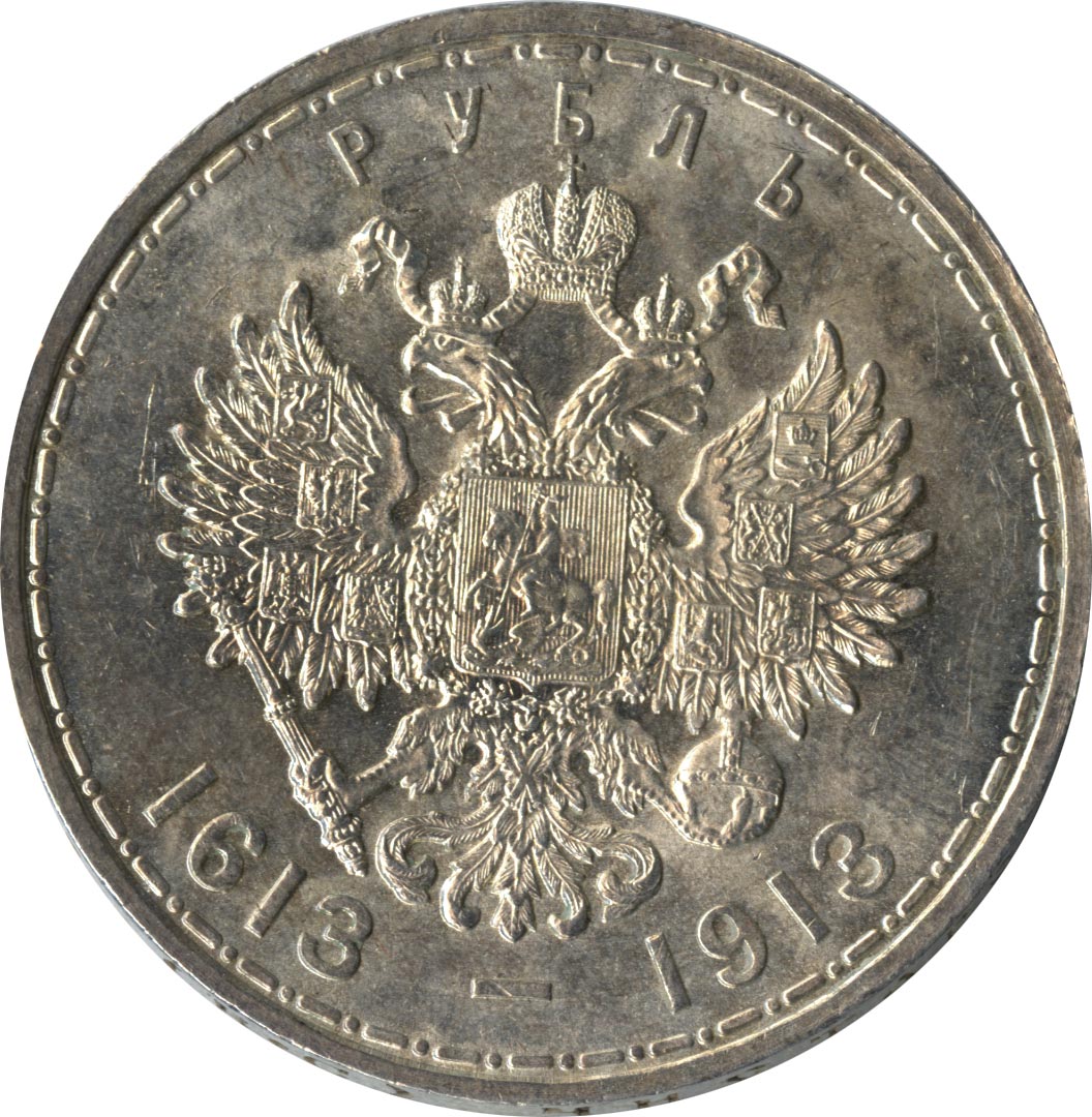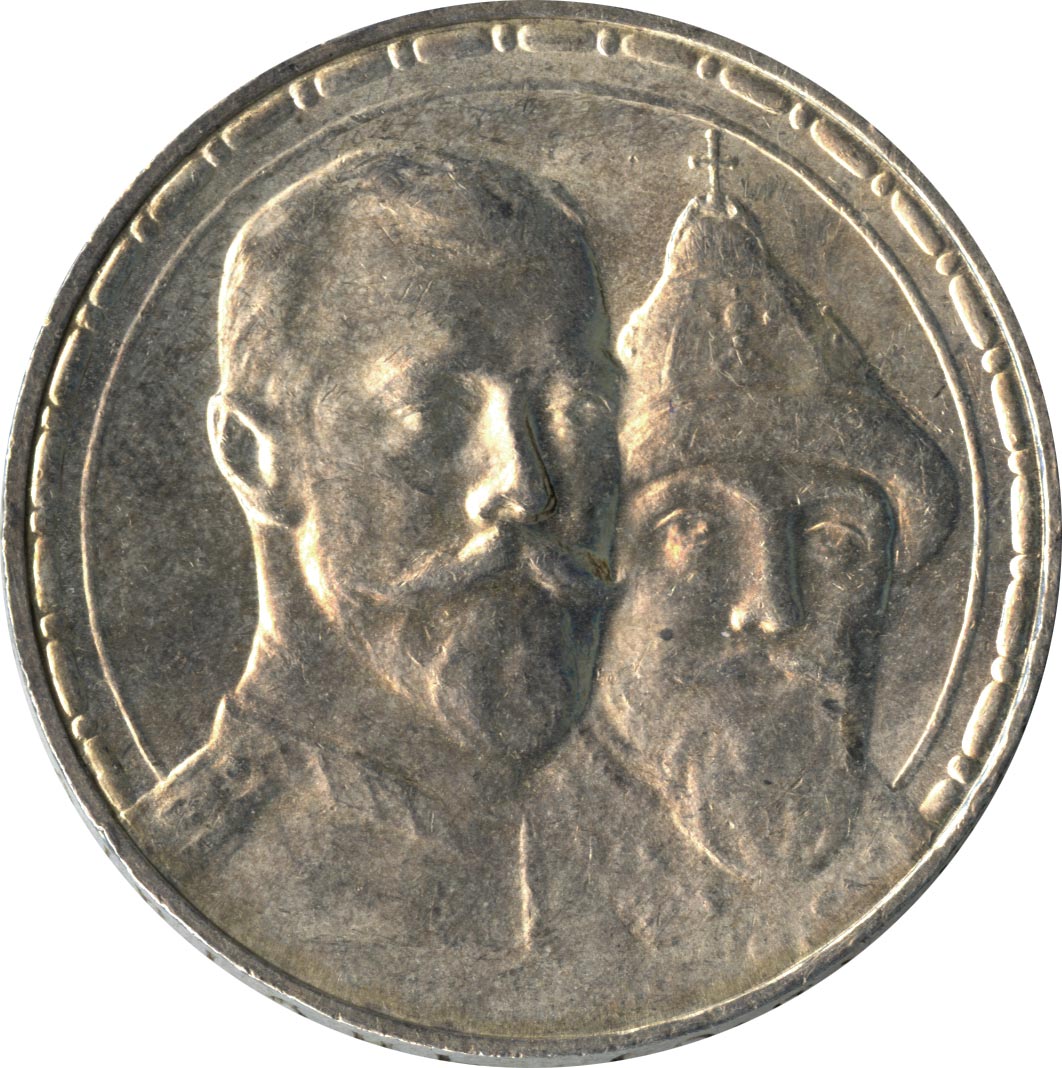 К 300-летию царствования Дома Романовых выпустили и юбилейный рубль, отчеканенный грандиозным тиражом почти в полтора миллиона экземпляров. На лицевой стороне монеты разместили портрет императора Николая II в военной форме, за спиной которого виден основатель династии, царь Михаил Романов в царском одеянии и в шапке Мономаха.
