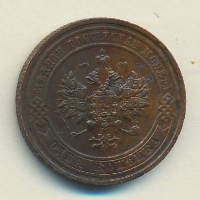 Лицевая сторона — двуглавый орел, надпись МЕДНАЯ РОССIЙСКАЯ МОНЕТА и обозначение номинала (одна копейка); оборотная — обозначение номинала (1 копейка) в бусовом ободке и дата. Нормативный вес — 3,28 грамма, гурт рубчатый.