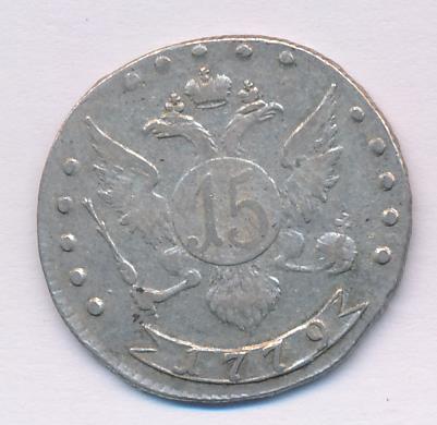 Медальер — Тимофей Иванов ( без знака или TI в рукаве). На оборотной стороне монеты — пятнадцать счетных точек. Проба — 750, нормативный вес — 3,56 грамма, гурт — шнур.