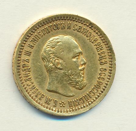Лицевая сторона — портрет Александра III и надпись «Б.М.АЛЕКСАНДРЪ III ИМПЕРАТОРЪ И САМОДЕРЖЕЦЪ ВСЕРОССIЙСКIЙ»», оборотная — двуглавый орел, обозначение номинала (5 рублей) и дата.