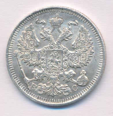 Лицевая сторона — гербовый орел, оборотная —обозначение номинала (20 копеекъ), окруженное венком из лавровой и дубовой ветвей и дата.
