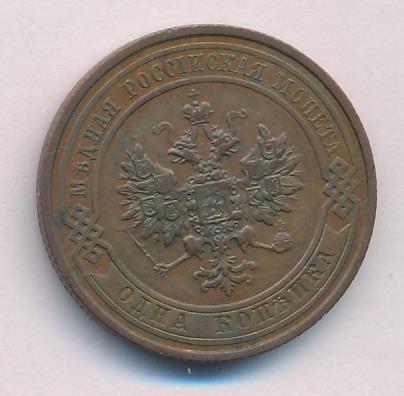 Лицевая сторона — двуглавый орел, надпись МЕДНАЯ РОССIЙСКАЯ МОНЕТА и обозначение номинала (одна копейка); оборотная — обозначение номинала (1 копейка) в бусовом ободке и дата. Нормативный вес — 3,28 грамма, гурт рубчатый.