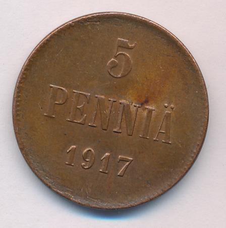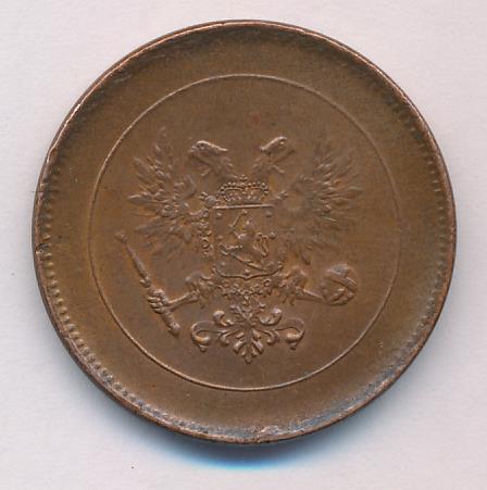 Лицевая сторона — вензель Александра II, оборотная — номинал (5 PENNIA) и дата. Нормативный вес — 6,40 грамма, гурт гладкий.