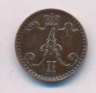 Лицевая сторона — вензель Александра II, оборотная — номинал (1 PENNIA) и дата. Нормативный вес — 1,28 грамма, гурт гладкий.