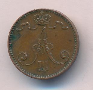 Лицевая сторона — вензель Александра II, оборотная — номинал (1 PENNIA) и дата. Нормативный вес — 1,28 грамма, гурт гладкий.