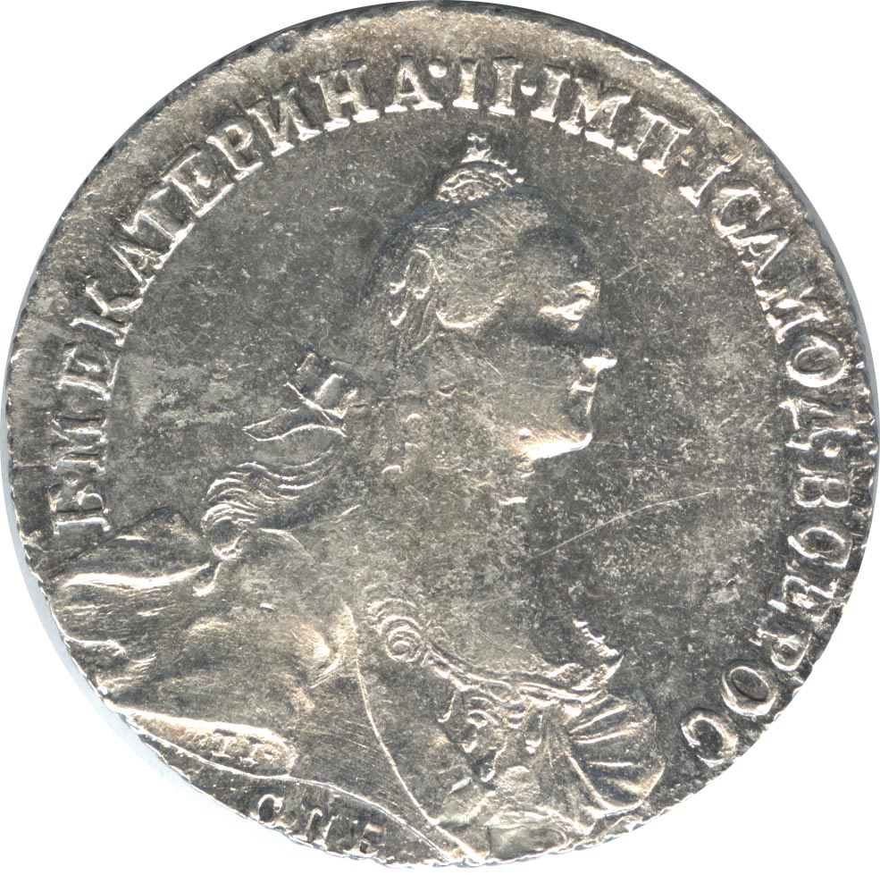 Лицевая сторона — портрет императрицы и надпись «Б М ЕКАТЕРИНА II IМП I САМОД ВСЕРОС», оборотная — двуглавый орел и надпись «МОНЕТА ПОЛТИНА» и дата. Проба — 750, нормативный вес — 12 граммов, гурт — шнур.