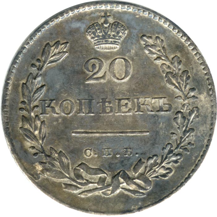 Лицевая сторона - «масонский орел» и дата, оборотная - окруженное венком из лавровой и дубовой обозначение номинала (20 копеекъ). Проба — 868, нормативный вес — 4,15 грамма.