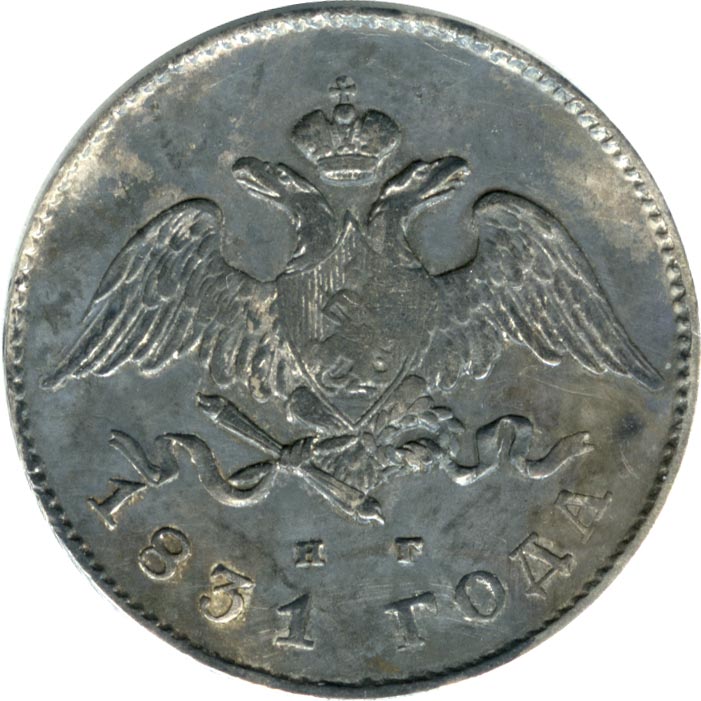 Указом от 1 июля 1826 года Николай I сохраняет вес и пробу золотых и серебряных монет, но приводит к единообразию их внешний вид. На серебряные монеты, вслед за золотыми, помещается новый герб - так называемый «масонский» орел с опущенными крыльями, на груди которого московский герб, в лапах факелы, лавровый венок, ликторский пучок и лента, без корон на головах. См. Статью «Масонский орел» на сайте «Конрос».