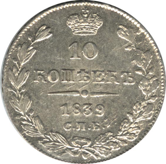 Лицевая сторона — новый гербовый орел с поднятыми крыльями, оборотная —обозначение номинала (10 копеекъ), окруженное венком из лавровой и дубовой ветвей и дата. Проба — 868, нормативный вес — 2,07 грамма.