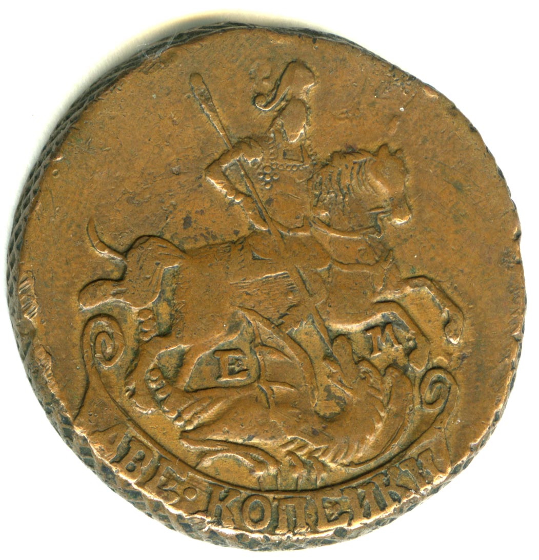 Лицевая сторона — Георгий Победоносец и обозначение номинала (две копейки) в картуше, оборотная — вензель Екатерины II и дата. Нормативный вес — 20,48 грамма, гурт — сетка или шнур.
