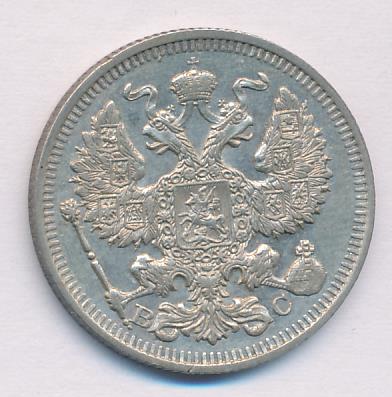 Лицевая сторона — гербовый орел, оборотная —обозначение номинала (20 копеекъ), окруженное венком из лавровой и дубовой ветвей и дата.
