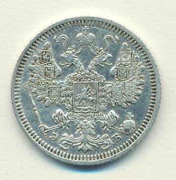 Лицевая сторона — гербовый орел, оборотная —обозначение номинала (15 копеекъ), окруженное венком из лавровой и дубовой ветвей и дата.