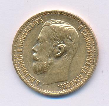 Лицевая сторона — портрет Николая II и надпись «Б.М. НИКОЛАЙ II ИМПЕРАТОРЪ И САМОДЕРЖЕЦЪ ВСЕРОСС»», оборотная — двуглавый орел, обозначение номинала (5 рублей) и дата.