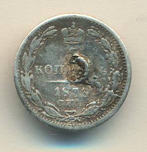 Лицевая сторона — новый гербовый орел с поднятыми крыльями, оборотная —обозначение номинала (5 копеекъ), окруженное венком из лавровой и дубовой ветвей и дата. Проба — 868, нормативный вес — 1,04 грамма.