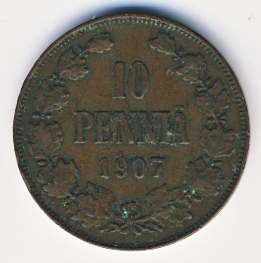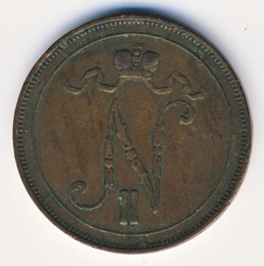 Лицевая сторона — вензель Александра II, оборотная — номинал (10 PENNIA) в венке из дубовых ветвей и дата. Нормативный вес — 12,80 грамма, гурт гладкий.