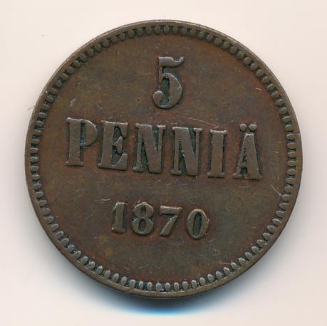 Лицевая сторона — вензель Александра II, оборотная — номинал (5 PENNIA) и дата. Нормативный вес — 6,40 грамма, гурт гладкий.