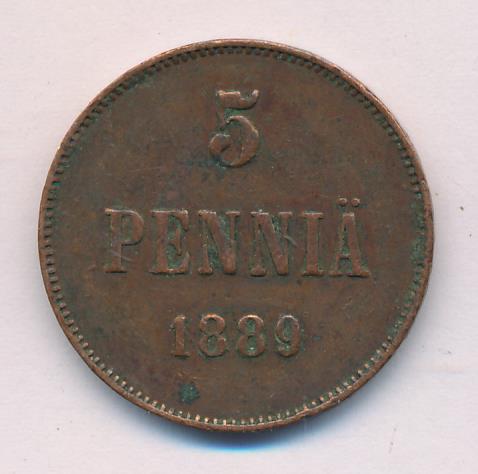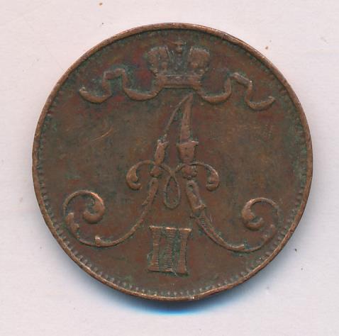Лицевая сторона — вензель Александра II, оборотная — номинал (5 PENNIA) и дата. Нормативный вес — 6,40 грамма, гурт гладкий.