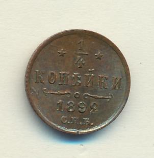 Лицевая сторона — вензель Александра II в венке из лавровой и дубовой ветвей; оборотная — обозначение номинала (1/4 копейки) и дата. Нормативный вес — 0,82 грамма, гурт рубчатый.