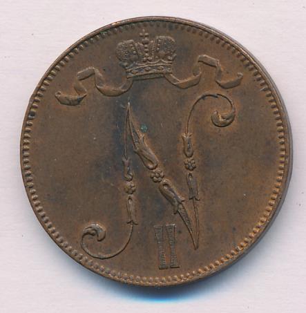 Лицевая сторона — вензель Александра II, оборотная — номинал (5 PENNIA) и дата. Нормативный вес — 6,40 грамма, гурт гладкий.