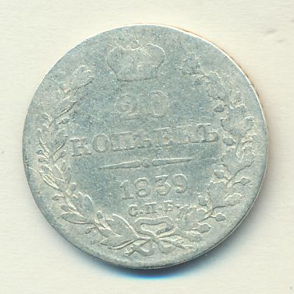 Лицевая сторона — новый гербовый орел с поднятыми крыльями, оборотная —обозначение номинала (20 копеекъ), окруженное венком из лавровой и дубовой ветвей и дата. Проба — 868, нормативный вес — 4,15 грамма.