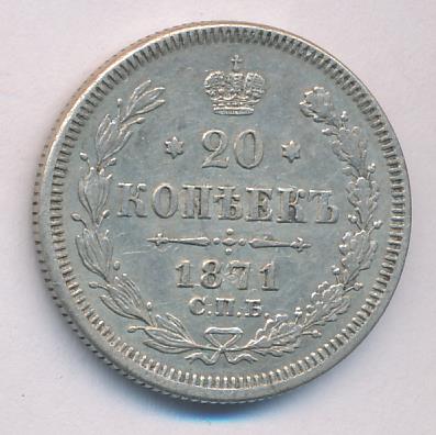 Лицевая сторона — гербовый орел, оборотная —обозначение номинала (20 копеекъ), окруженное венком из лавровой и дубовой ветвей и дата.