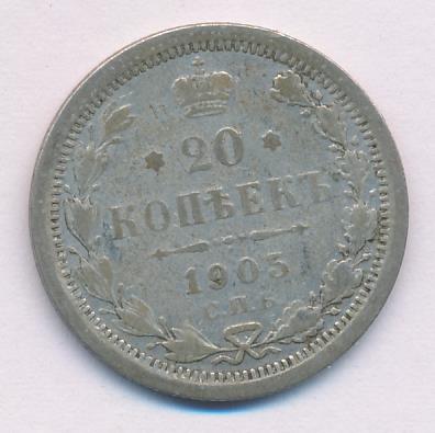 Лицевая сторона — гербовый орел, оборотная —обозначение номинала (20 копеекъ), окруженное венком из лавровой и дубовой ветвей и дата.