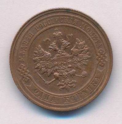 Лицевая сторона — двуглавый орел, надпись МЕДНАЯ РОССIЙСКАЯ МОНЕТА и обозначение номинала (одна копейка); оборотная — обозначение номинала (1 копейка) в бусовом ободке и дата. Нормативный вес — 3,28 грамма, гурт рубчатый.