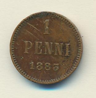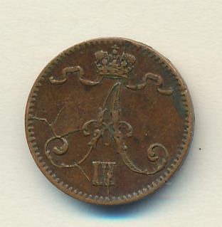 Лицевая сторона — вензель Александра II, оборотная — номинал (1 PENNIA) и дата. Нормативный вес — 1,28 грамма, гурт гладкий.