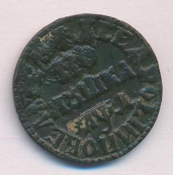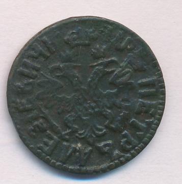 На лицевой стороне — гербовый орел и надпись «царь петр алексеевич», на оборотной - «всея россии самодержец» и обозначение номинала (полушка).