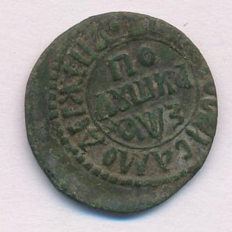 На лицевой стороне — гербовый орел и надпись «царь петр алексеевич», на оборотной - «всея россии самодержец» и обозначение номинала (полушка).