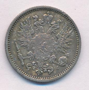 Лицевая сторона — российский двуглавый орел с гербом Великого княжества Финляндского на груди, оборотная — номинал и дата в венке из дубовых листьев. Проба — 750, нормативный вес — 2,55 грамма, гурт рубчатый.