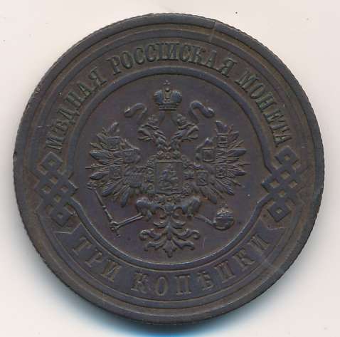 Лицевая сторона — двуглавый орел, надпись МЕДНАЯ РОССIЙСКАЯ МОНЕТА и обозначение номинала (три копейки); оборотная — обозначение номинала (3 копейки) в бусовом ободке и дата. Нормативный вес — 9,83 грамма, гурт рубчатый.
