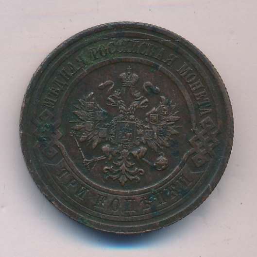 Лицевая сторона — двуглавый орел, надпись МЕДНАЯ РОССIЙСКАЯ МОНЕТА и обозначение номинала (три копейки); оборотная — обозначение номинала (3 копейки) в бусовом ободке и дата. Нормативный вес — 9,83 грамма, гурт рубчатый.