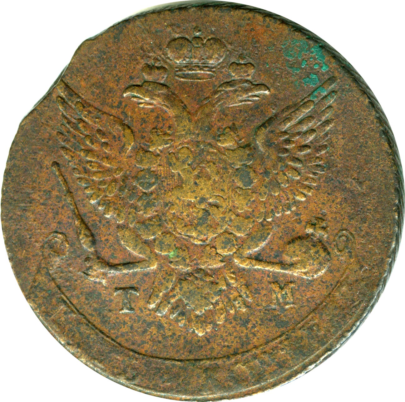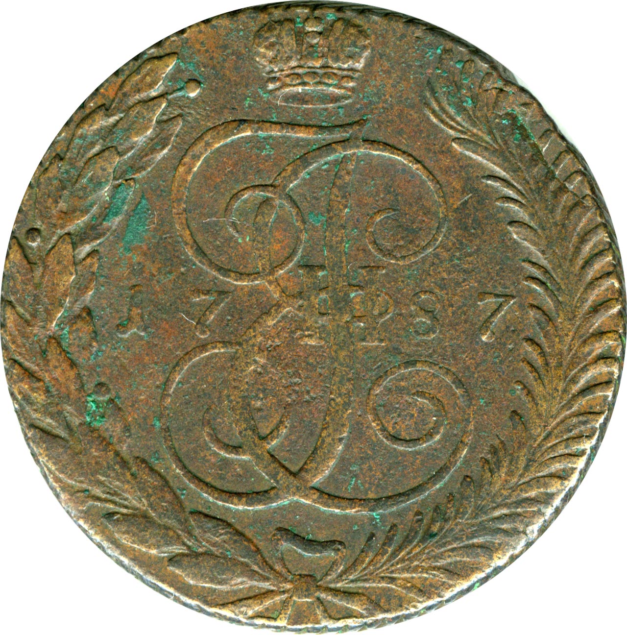 Лицевая сторона — двуглавый орел (выделяют 17 типов орла) и обозначение номинала (пять копеекъ), оборотная — вензель Екатерины II и дата. Нормативный вес — 51,19 грамма, гурт — сетка или шнур.
