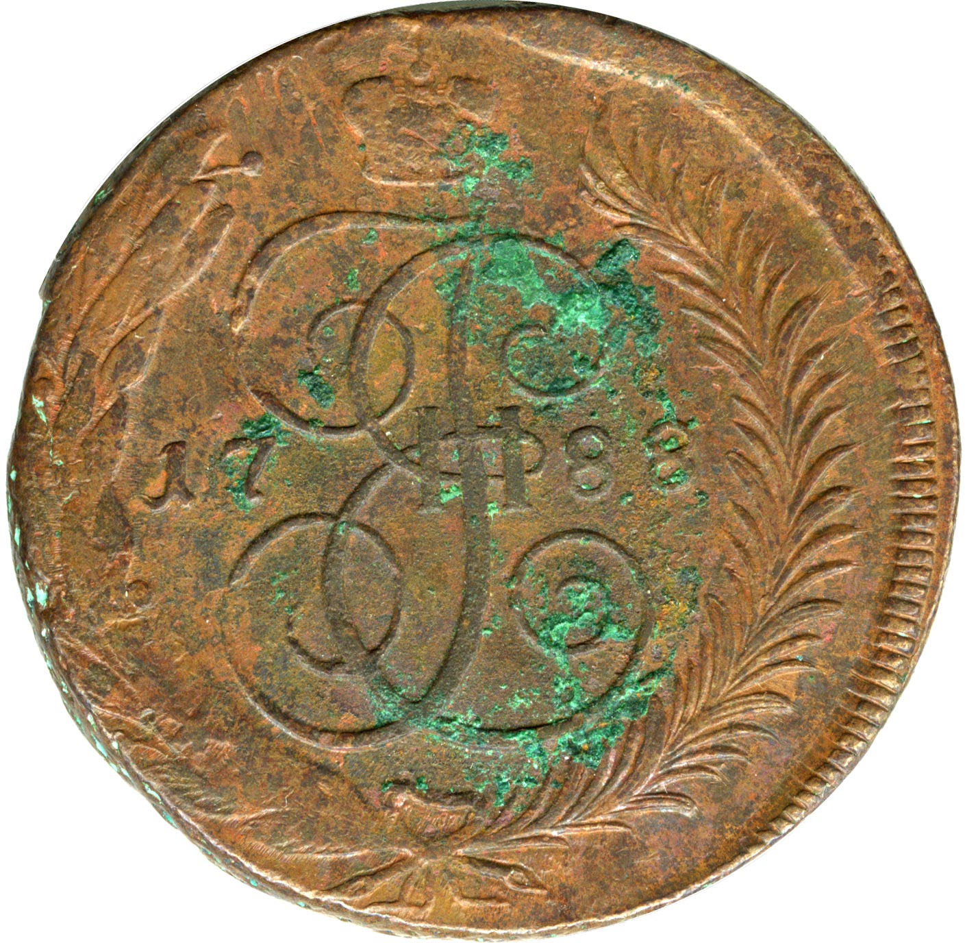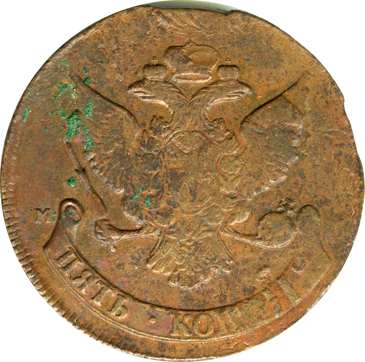 Лицевая сторона — двуглавый орел (выделяют 17 типов орла) и обозначение номинала (пять копеекъ), оборотная — вензель Екатерины II и дата. Нормативный вес — 51,19 грамма, гурт — сетка или шнур.