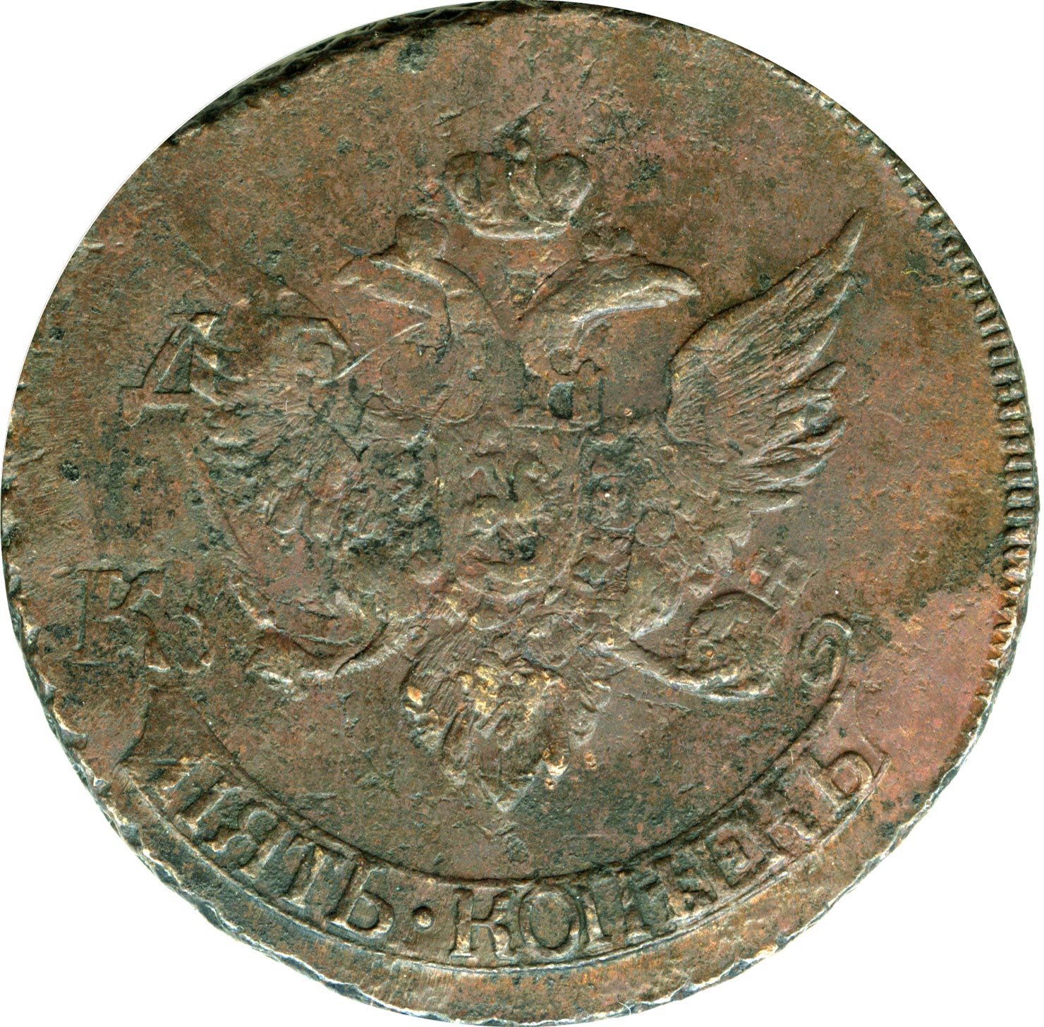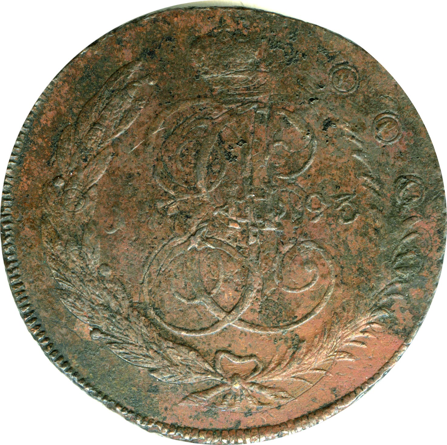 Лицевая сторона — двуглавый орел (выделяют 17 типов орла) и обозначение номинала (пять копеекъ), оборотная — вензель Екатерины II и дата. Нормативный вес — 51,19 грамма, гурт — сетка или шнур.