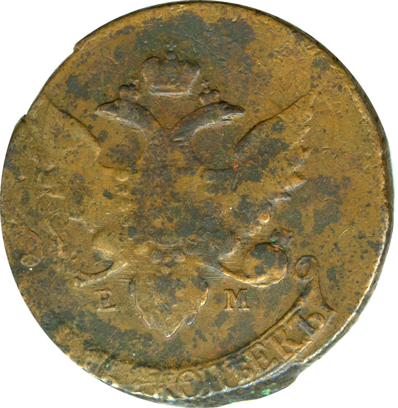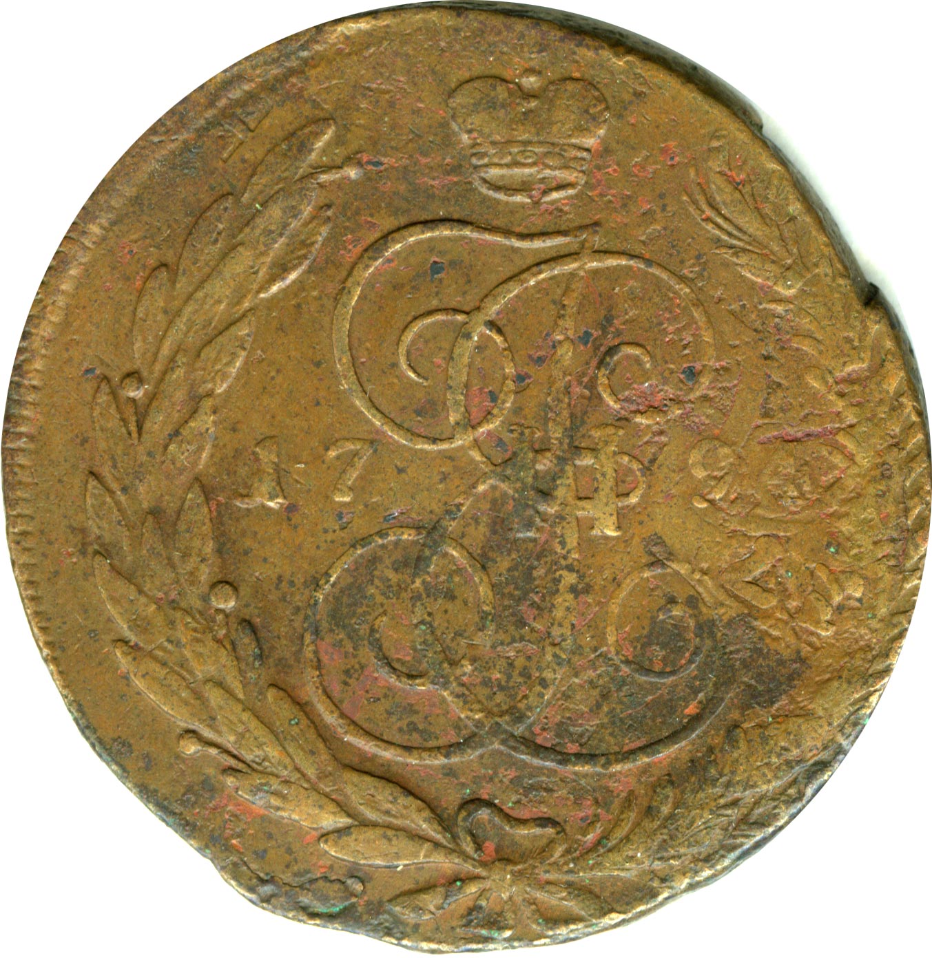 Лицевая сторона — двуглавый орел (выделяют 17 типов орла) и обозначение номинала (пять копеекъ), оборотная — вензель Екатерины II и дата. Нормативный вес — 51,19 грамма, гурт — сетка или шнур.