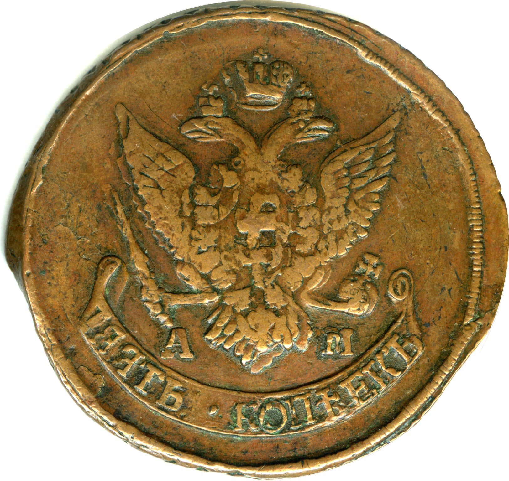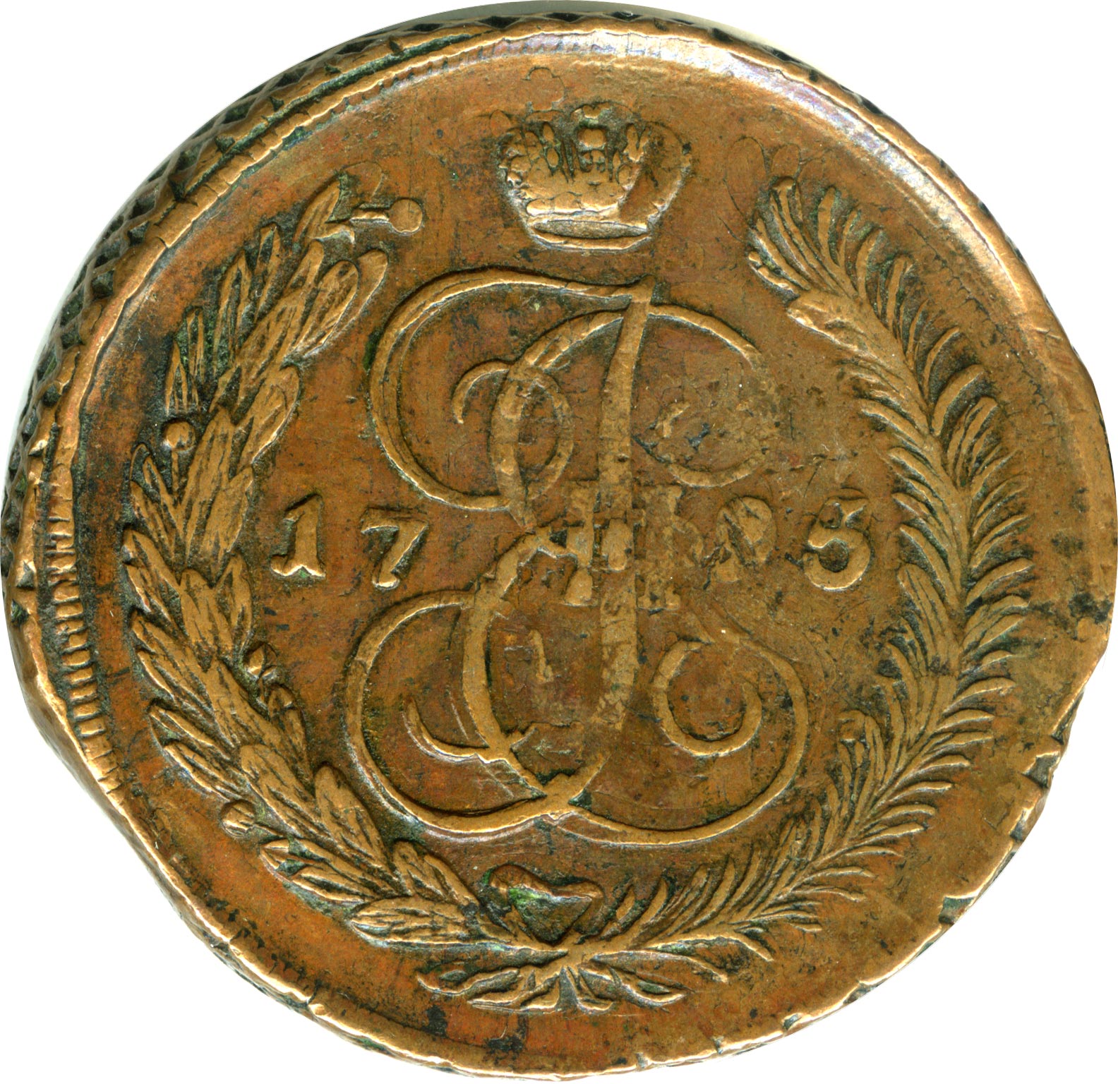 Лицевая сторона — двуглавый орел (выделяют 17 типов орла) и обозначение номинала (пять копеекъ), оборотная — вензель Екатерины II и дата. Нормативный вес — 51,19 грамма, гурт — сетка или шнур.