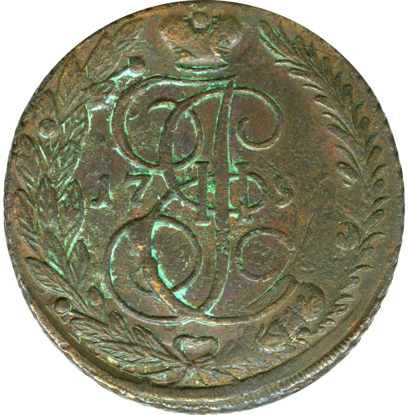 Лицевая сторона — двуглавый орел (выделяют 17 типов орла) и обозначение номинала (пять копеекъ), оборотная — вензель Екатерины II и дата. Нормативный вес — 51,19 грамма, гурт — сетка или шнур.