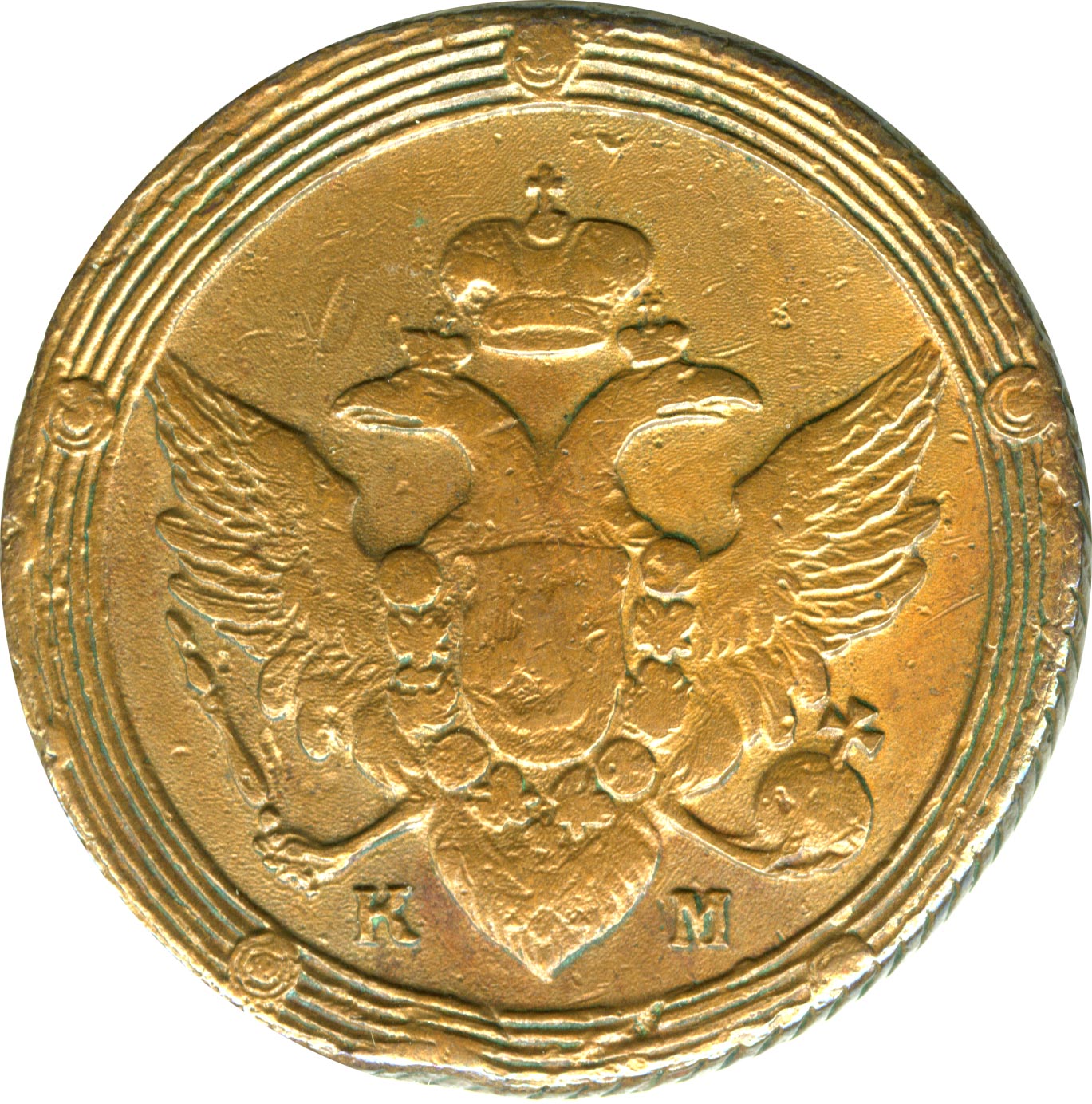В первое десятилетие правления Александра I медным монетам возвращается принятый при Екатерине II ряд номиналов. Все они оформлены единообразно: на лицевой стороне — двуглавый орел, на оборотной — номинал и дата. Обе стороны обрамлены концентрическими линейными кружками, номинал дополнительно продублирован крупными счетными точками.