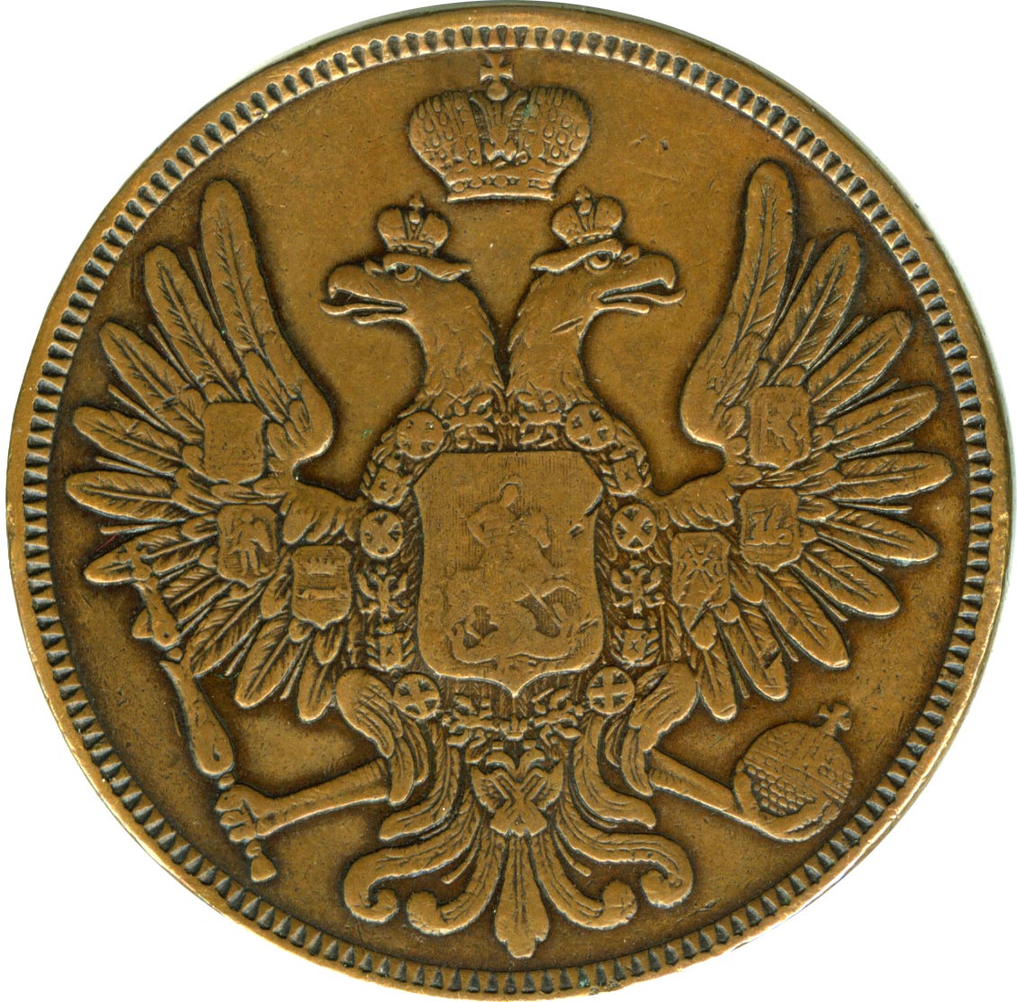 Меры правительства по стабилизации денежного обращения дали свои результаты, и указом от 7 февраля 1849 года следует очередное удвоение монетной стопы до 32 рублей из пуда. Новую монету решено делать улучшенного оформления и повышенного качества изготовления. На лицевую сторону возвращается государственный герб, а все производство ведется только на Екатеринбургском дворе (знак ЕМ), который после 1844 года усиленно перестраивается и переоснащается по образцу Петербургского. С 1850 года к нему подключается Варшавский (знак ВМ), получивший специальное разрешение на выпуск общегосударственной медной монеты. Штемпельный инструмент для обоих дворов готовит Петербургский двор. Новые монеты поступают в обращение только после указа от 23 января 1853 года, после приготовления на общую сумму 870 720 рублей (без учета Варшавской чеканки).