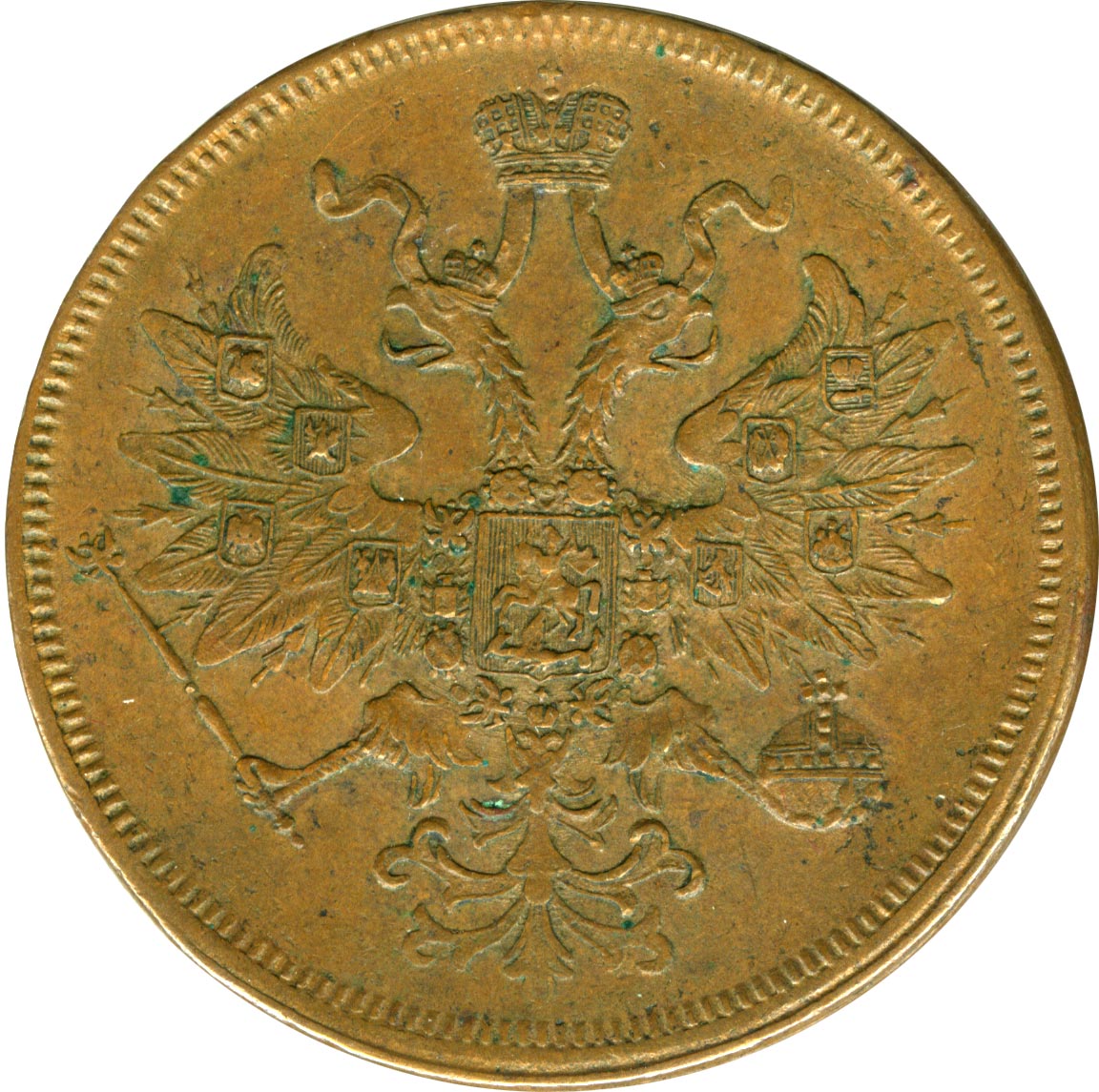 Меры правительства по стабилизации денежного обращения дали свои результаты, и указом от 7 февраля 1849 года следует очередное удвоение монетной стопы до 32 рублей из пуда. Новую монету решено делать улучшенного оформления и повышенного качества изготовления. На лицевую сторону возвращается государственный герб, а все производство ведется только на Екатеринбургском дворе (знак ЕМ), который после 1844 года усиленно перестраивается и переоснащается по образцу Петербургского. С 1850 года к нему подключается Варшавский (знак ВМ), получивший специальное разрешение на выпуск общегосударственной медной монеты. Штемпельный инструмент для обоих дворов готовит Петербургский двор. Новые монеты поступают в обращение только после указа от 23 января 1853 года, после приготовления на общую сумму 870 720 рублей (без учета Варшавской чеканки).