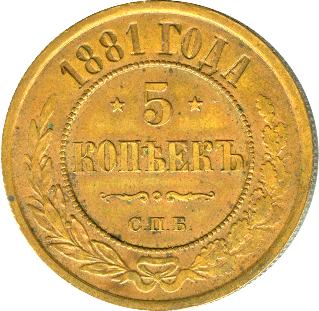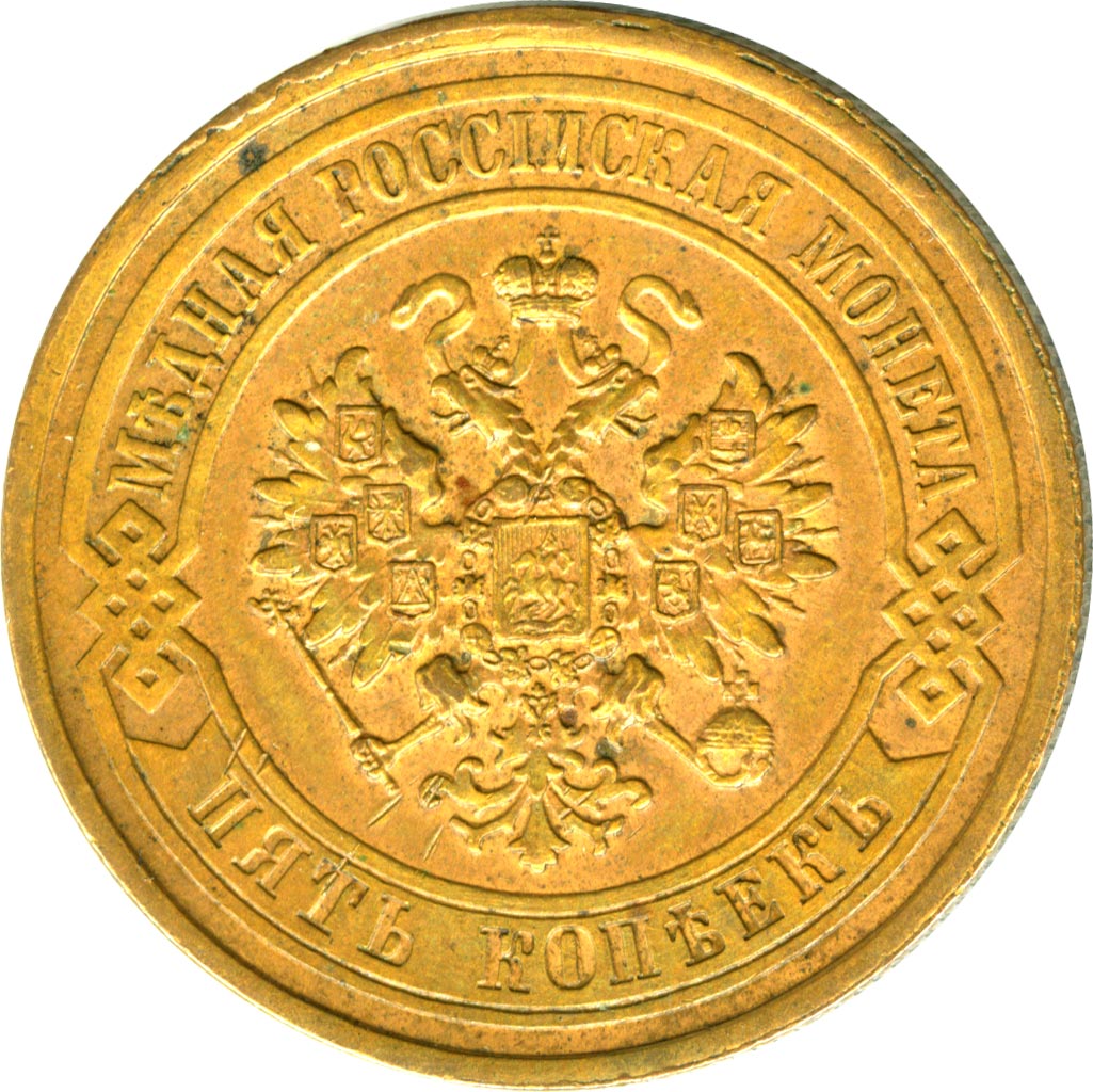 Лицевая сторона — двуглавый орел, надпись МЕДНАЯ РОССIЙСКАЯ МОНЕТА и обозначение номинала (пять копеекъ); оборотная — обозначение номинала (5 копеекъ) в бусовом ободке и дата. Нормативный вес — 16,38 грамма, гурт рубчатый.