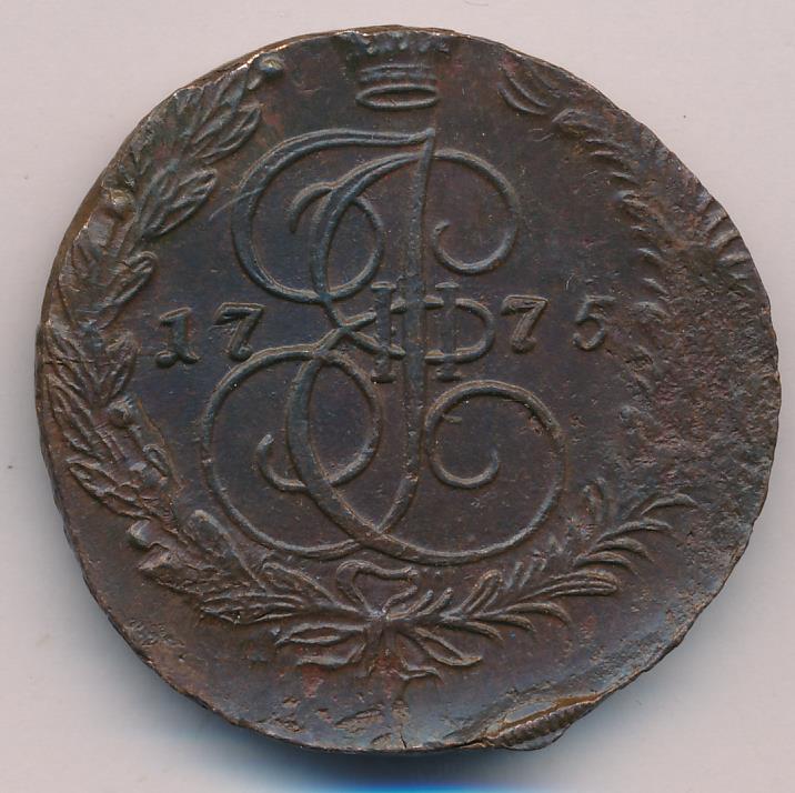 Лицевая сторона — двуглавый орел (выделяют 17 типов орла) и обозначение номинала (пять копеекъ), оборотная — вензель Екатерины II и дата. Нормативный вес — 51,19 грамма, гурт — сетка или шнур.