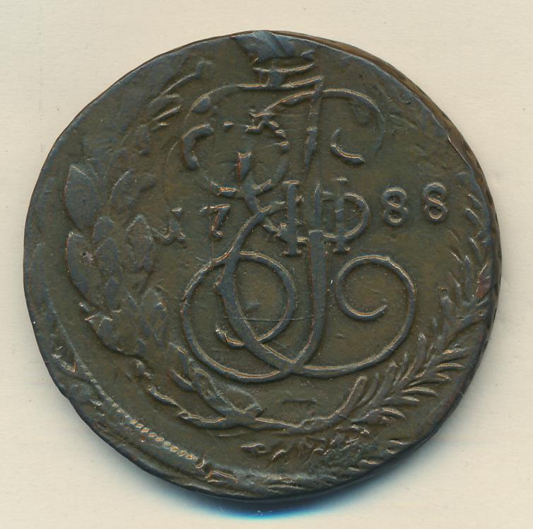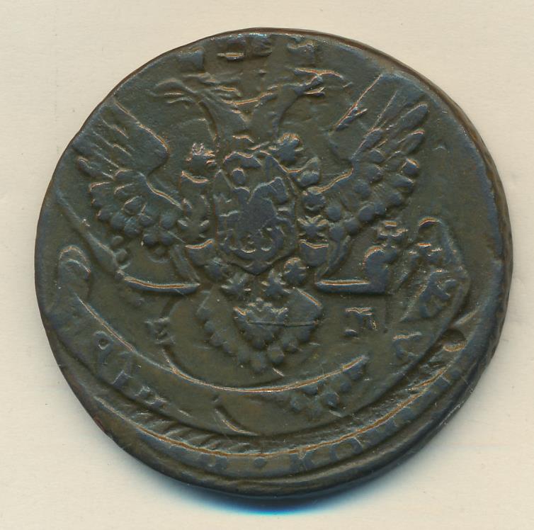 Лицевая сторона — двуглавый орел (выделяют 17 типов орла) и обозначение номинала (пять копеекъ), оборотная — вензель Екатерины II и дата. Нормативный вес — 51,19 грамма, гурт — сетка или шнур.