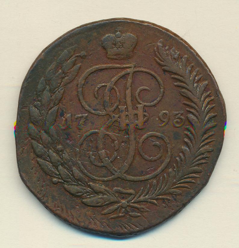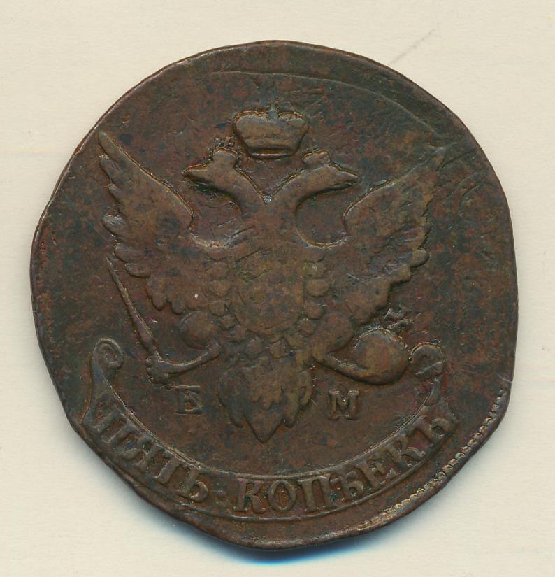 Лицевая сторона — двуглавый орел (выделяют 17 типов орла) и обозначение номинала (пять копеекъ), оборотная — вензель Екатерины II и дата. Нормативный вес — 51,19 грамма, гурт — сетка или шнур.